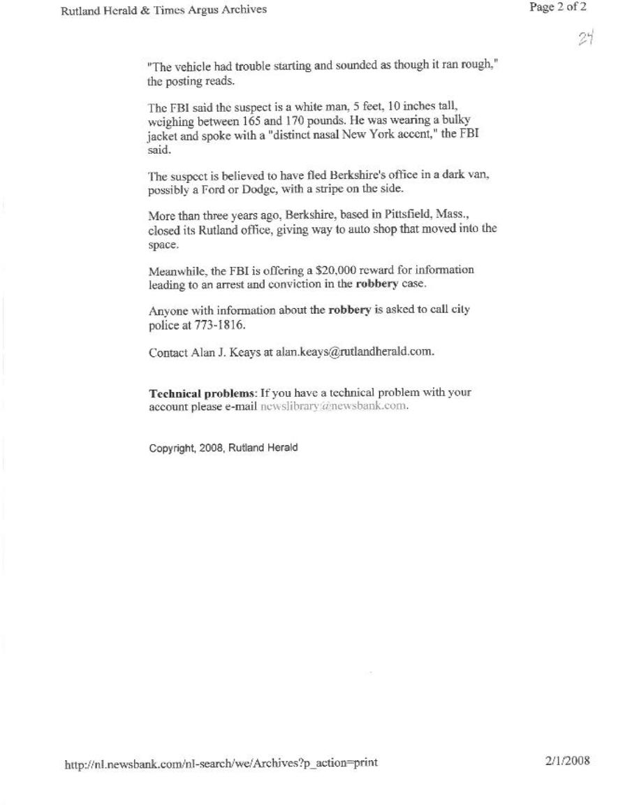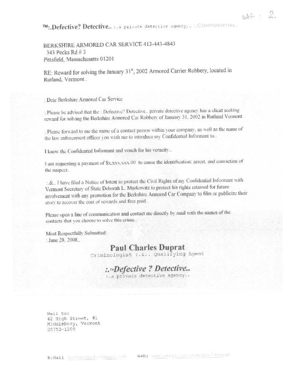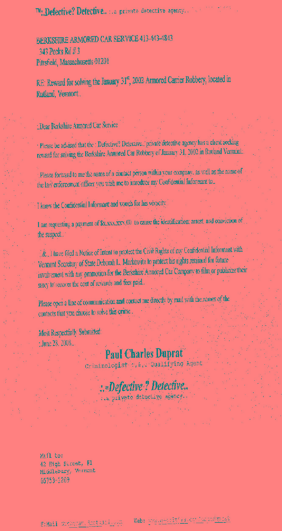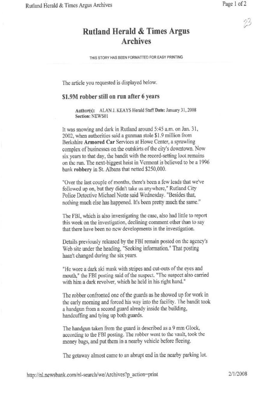 :.The Berkshire Armored Car Robbery.. :.January 31st, 2002.. :.The Largest Armed Robbery In Vermont History.. :.This page documents the efforts to Notify the Victim that Intel is available to solve this crime, and demand the Confidential Informant be paid the REWARD Offered.. |