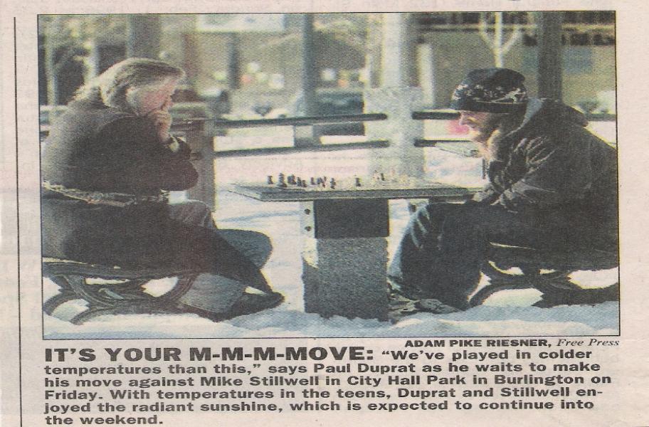 :.Native Vermonters enjoy a game of chess in City Hall Park.. brush off the snow from the table, and it's game.. |