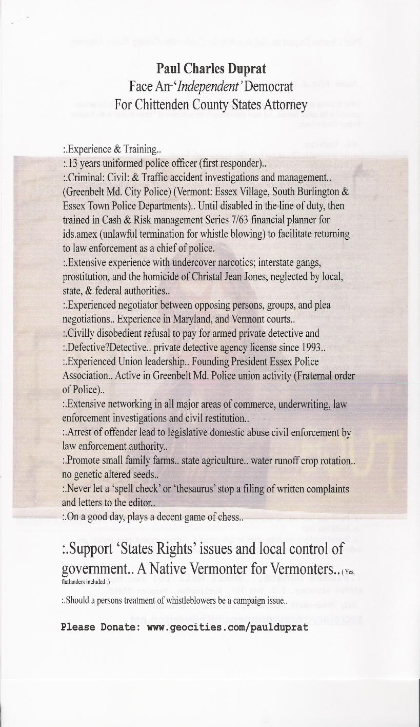 | :.Please contribute to my political campaign to become Chittenden County States Attorney.. the First amendment to the United States Constitution in reguards to Freedom of Speech; states, "Congress shall make no law respecting an establishment of religion, or prohibiting the free excercise thereof; or abridging the freedom of speech, or of the press; or of the right of the people peaceably to assemble, and to petition the government for a redress of grievances." Let me protect the issues of states' rights and federal intervention into local issues, protection of the doctor patient right to confidentiality and keeping the government out of the civil right to healthcare..supporting not only medical marijuana but the same approach as with regulating and taxing alcohol, with organic medical marijuanna dispensed through the existing licensing and regulating medical herbs; plants and potions.. Establishing a Vermont state identification for doctors and represent any doctor in charges of behavior in physicians duty to control pain by federal authority.. Help end the 'war on drugs' and address education; health care, and civil rights.. Violent offenders will be jailed and the non-violent drug offender will be offered treatment.. The issue of public health in infectious disease requires a licensing and regulating of acknowledged working prostitutes; with health care requierments.. Community Risk will be reduced with greater personal responsibility for public behavior being presented to the jury to determine community standards and enforcement in the common law with acceptance of native American tradition; accepted religious traditions, and common sense.. Strict enforcement of environmental laws; storm water runoff, slum lords and absentee landlords.. Neighborhood enforcement of noise and litter.. petition state legislature to adapt Handicapped Service Animals Laws.. Animal rights and protections, by protecting the natural habitat, establishing game reserves, and protecting the national forest.. :.Please direct your contribution to :.Paul Charles Duprat for Chittenden County States Attorney.. |
